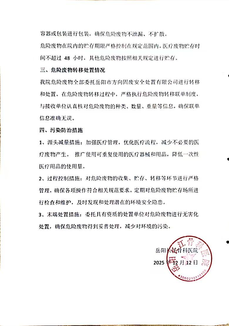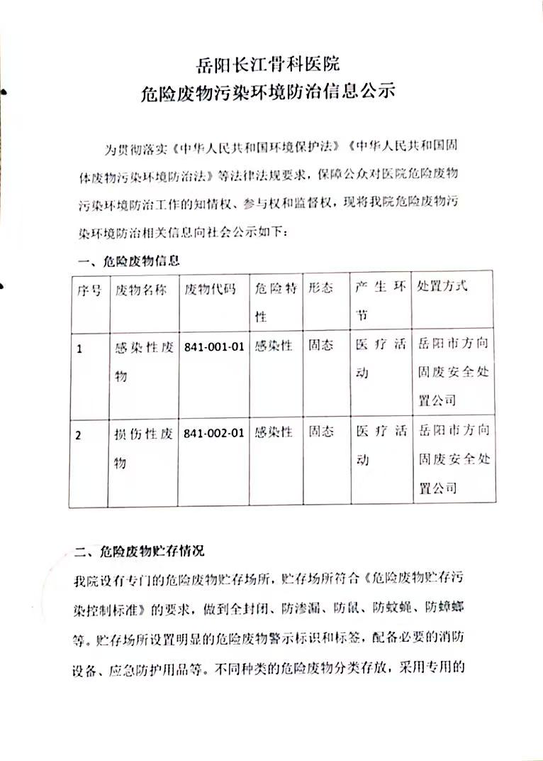 岳阳长江骨科医院危险废物污染环境防治信息公示